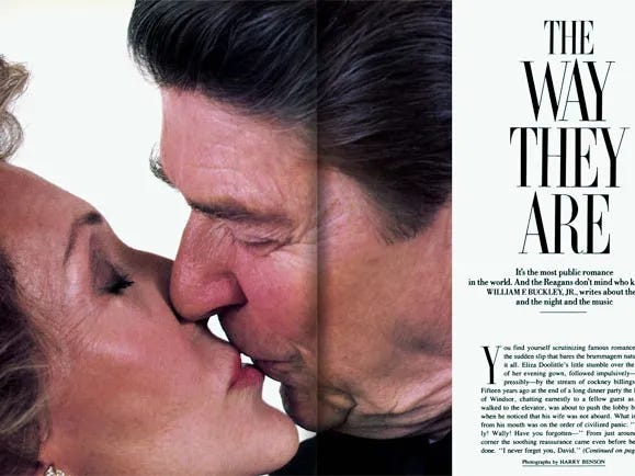 Enter: the kiss that saved the brand. It was Ronald and Nancy Reagan’s. Presidential profiles were rigid theater, but Brown saw the tension brewing. The country was drowning in political performance while becoming obsessed with peeking into the private lives of power. No one had the nerve to exploit that crack, but she did. Perhaps her lived experience of the tabloid culture around the monarchy in the UK led her to see this opportunity. At the time, The Reagans were the ultimate symbolic couple. Their image was currency and Brown spent it to buy back the nation’s attention.